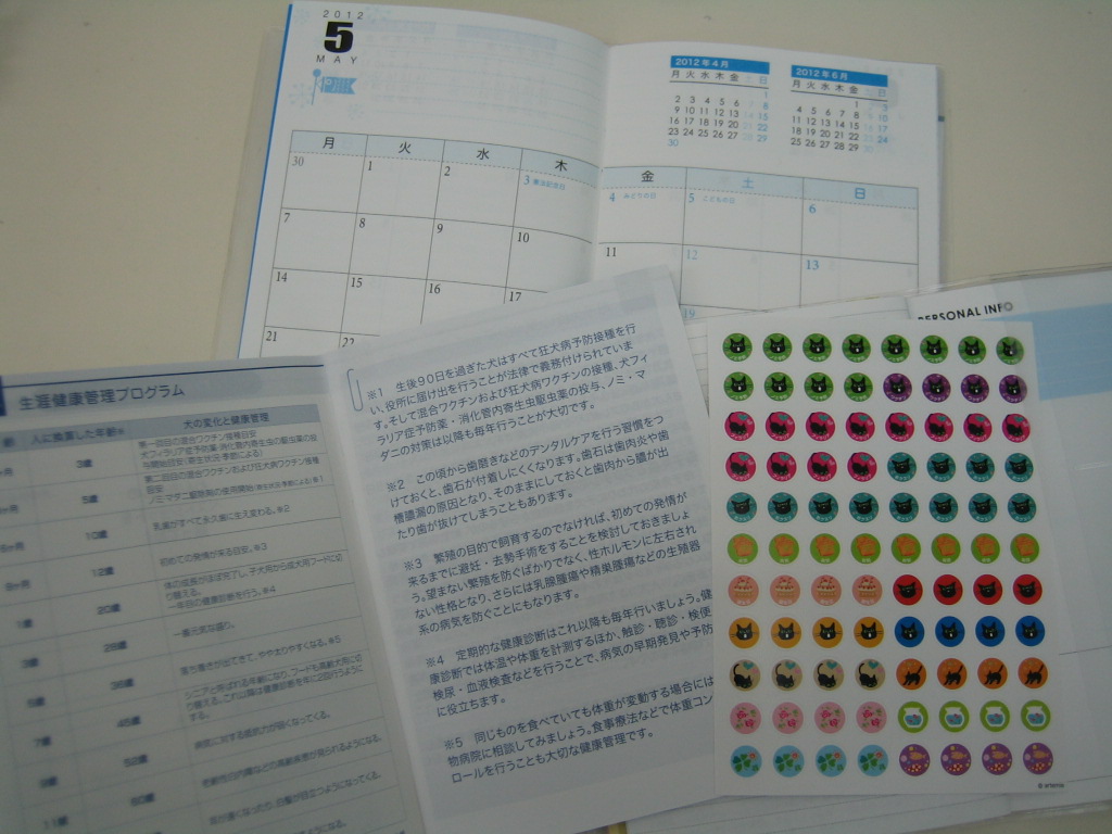 左から、犬用のハンドブック、犬猫共通のスケジュール帳、猫用のハンドブックになります。
