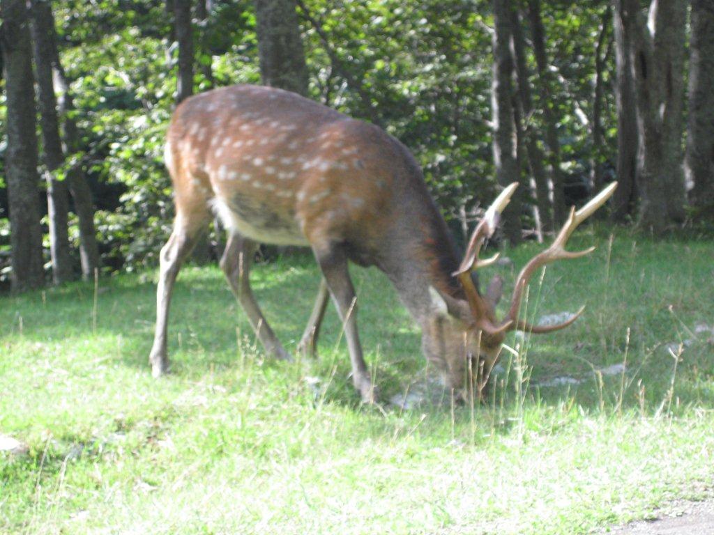↑ エゾシカです。道路の横で、お食事中。エゾシカは他の場所でもたくさん観察できました。